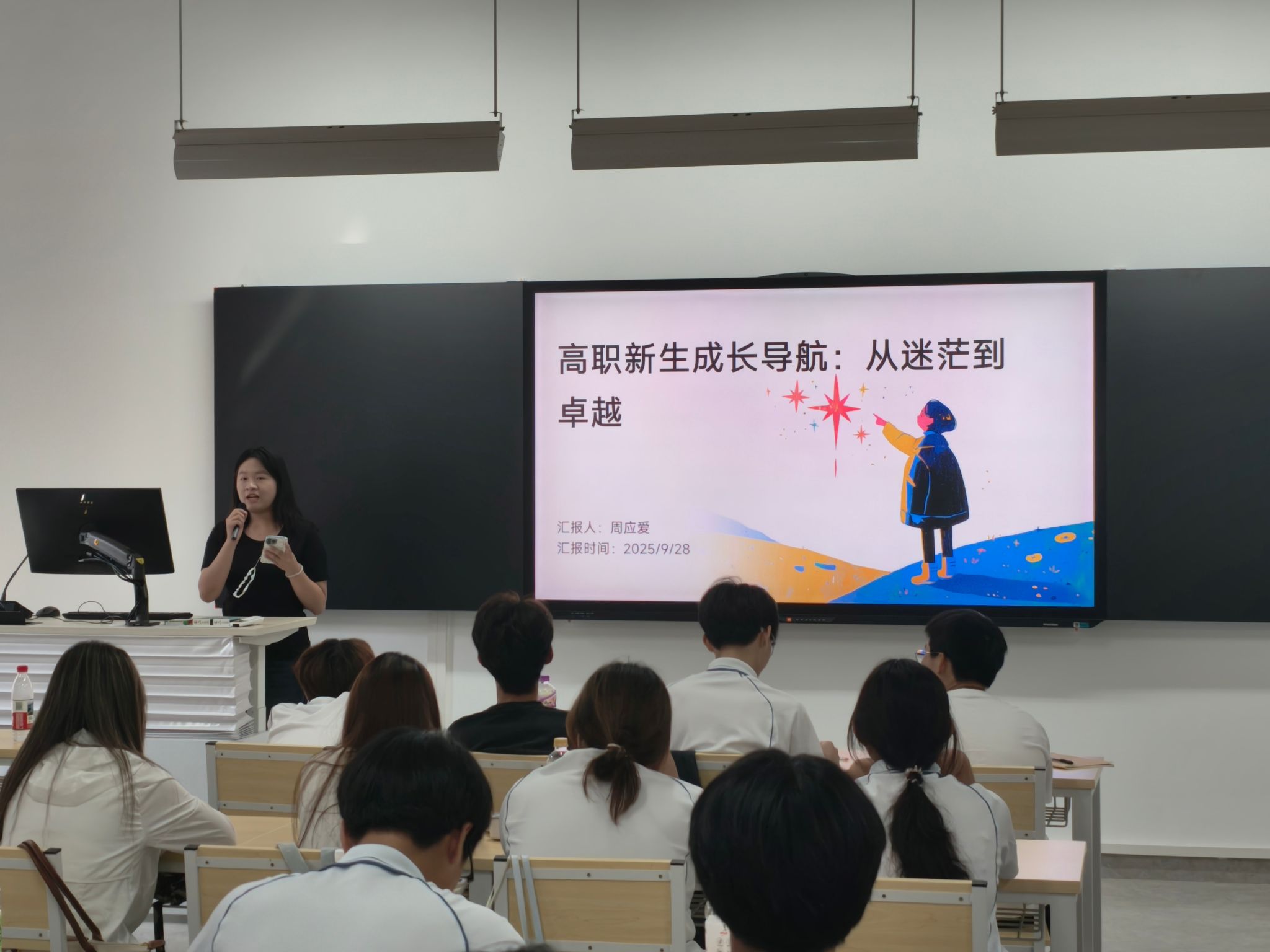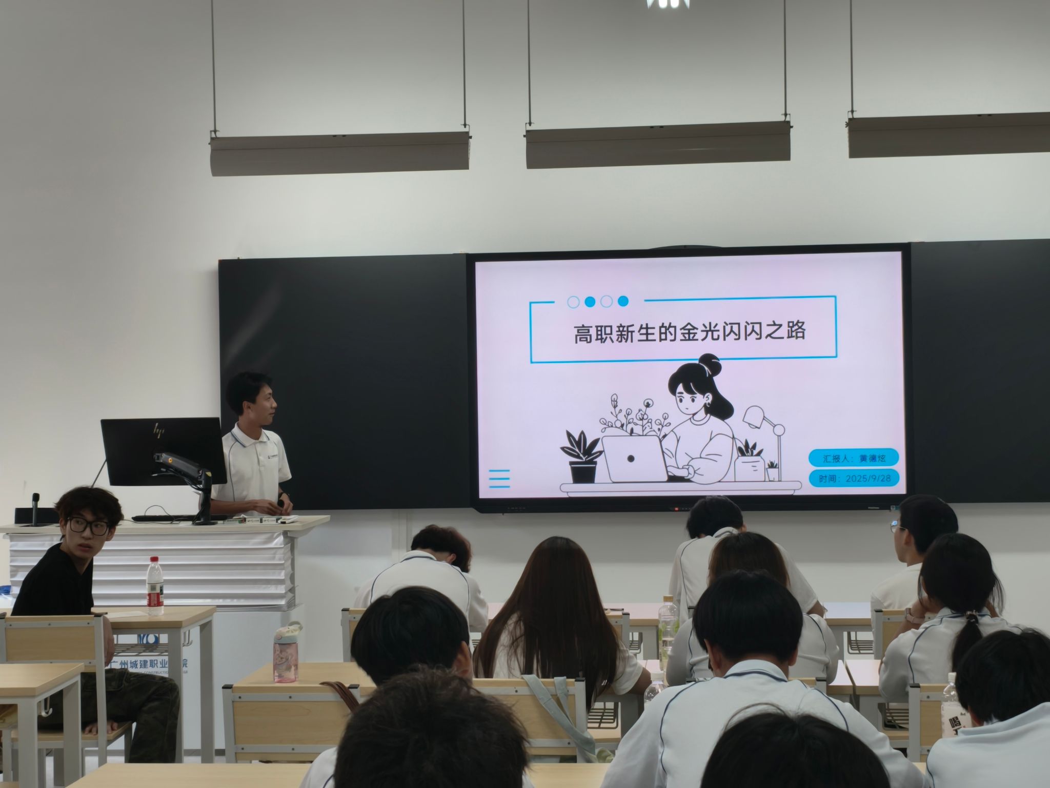 在学长学姐经验分享环节,2024级智慧管理班班长黄德炫及学姐周应爱,分别以“金光闪闪之路”“从迷茫到卓越”为主题,为初入校园的2025级新生开展了一场饱含温情与动力的成长指引活动。