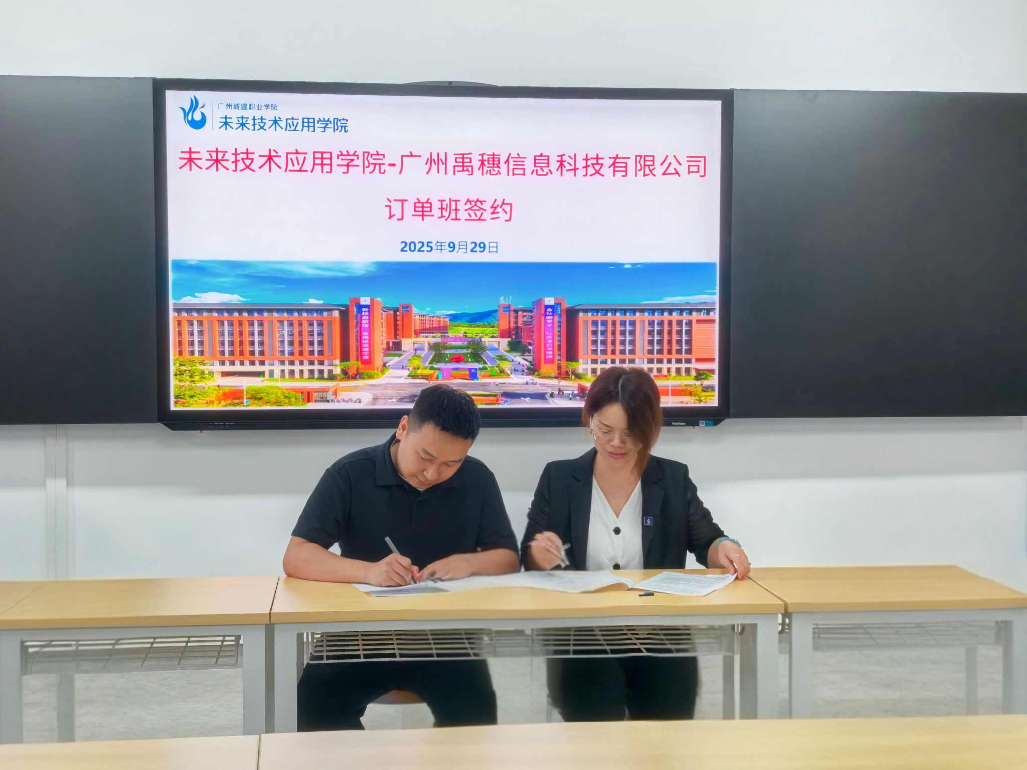 入学教育活动尾声,潘丹院长与在场的企业代表——禹穗集团赖总,在全场师生的共同见证下,庄重签署了“智慧城市管理技术订单班”合作协议。此次签约不仅将本次入学教育的氛围推向了最高潮,更标志着校企协同育人模式迈入了人才精准培养、供需无缝对接的新阶段,为新生们的未来职业发展提供了强有力的平台保障。