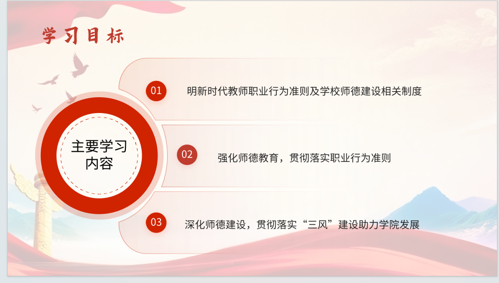 本次会议以 “大力弘扬教育家精神,三尺讲台守初心立德树人勇担当” 为核心,围绕 “新时代教师职业行为准则” 展开深入学习与交流,明确了三大学习目标:一是明晰新时代教师职业行为准则及教师师德建设相关制度,让教师们对职业规范有更清晰的认知;二是强化师德教育,贯彻落实职业行为准则,将准则要求内化于心、外化于行;三是深化师德建设,贯彻落实 “三风” 建设助力学院发展,以良好师德师风带动教风、学风,推动学院整体发展。现场,主题鲜明的宣讲内容通过屏幕呈现,“知新时代教师职业行为准则 自觉塑造新时代人民教师” 的字样醒目有力,既强调对教师职业规范的认知遵循,更传递出 “塑造新时代人民教师” 的使命召唤,激励教师们以教育家精神为指引,在教学岗位上坚守初心、履职尽责。