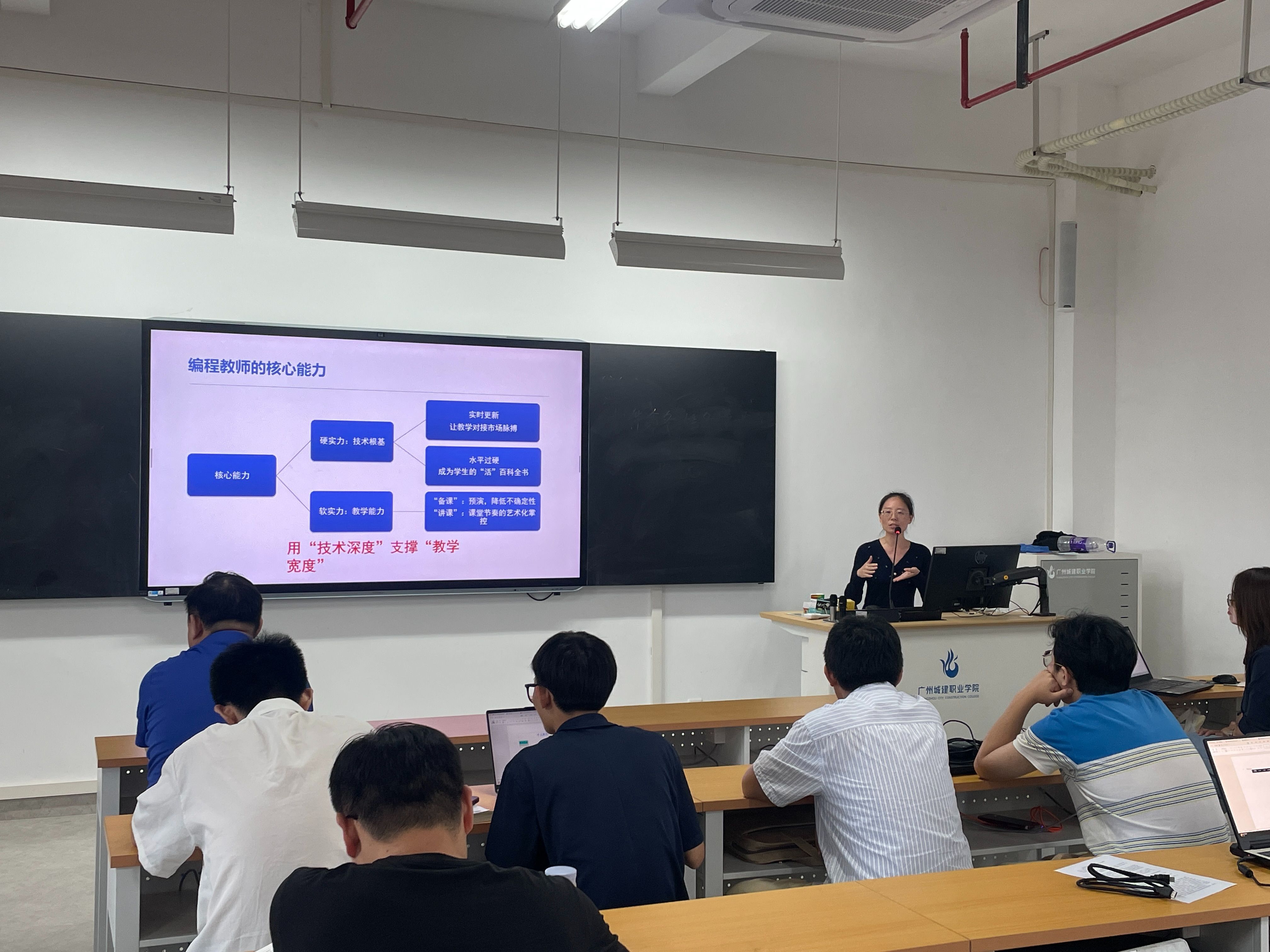 在专题分享环节,信息工程学院陈艳蕊老师 —— 拥有信息系统项目管理师、经济师双重专业认证,主持《微信小程序开发》校精品课程、省级重点项目《基于最优化理论的荔枝多元化供应链决策模型研究》,发表《多元化生产者视角下的供应链优化策略研究》论文及多项软件著作权 —— 以 “如何成为有温度的计算机教师” 与 “课程资源建设方法” 为核心展开分享。
