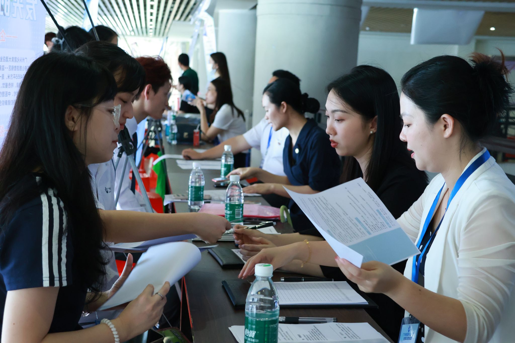 供需对接活动现场人潮涌动、氛围融洽,学生来回穿梭投递简历,积极表达参与意向并接受企业人员面试;企业人员认真对待学生需求,耐心解答疑问。