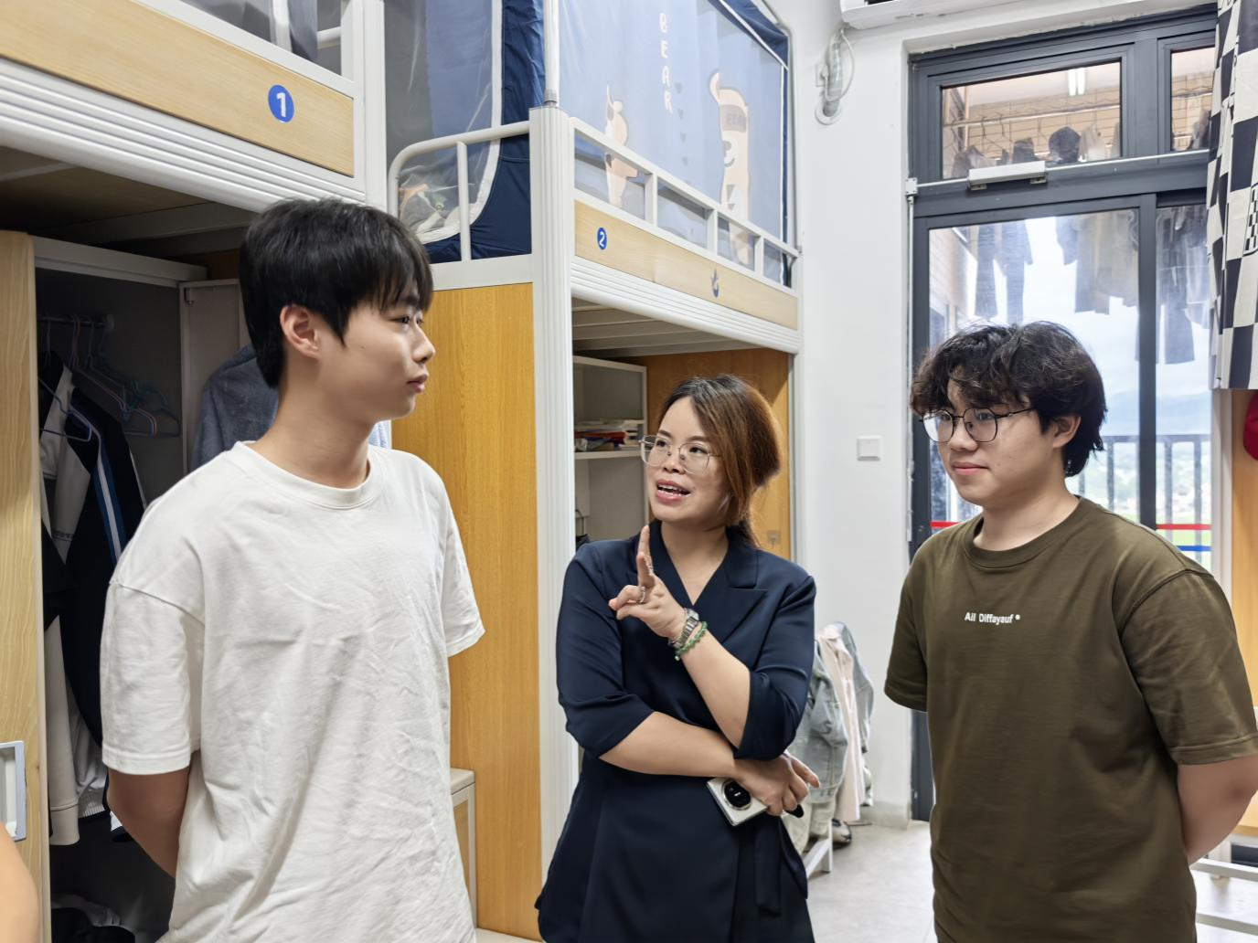 走访期间,学院领导逐间踏入学生寝室,与同学们亲切交流。在4号学生公寓10楼,潘丹副院长关切询问同学们近期课程的学习难度、备考安排以及校园生活的适应情况,对省外留校学生的饮食与作息需求给予了特别关注;对于准备返乡的学生,详细了解其往返交通方式,贴心提醒他们提前留意天气和路况信息,务必妥善保管个人财物。