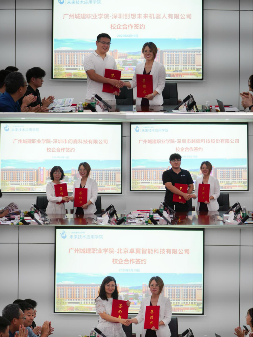 会议伊始,学院领导潘丹副院长致欢迎辞,向与会企业代表系统介绍了学校及学院的办学特色、专业建设成果与发展愿景。她强调:“人才培养必须紧跟技术迭代步伐,以企业真实需求为导向”。随后,学院为14家企业代表颁发“人工智能技术应用专业群人才培养特聘顾问”聘书,并与北京卓翼智能科技有限公司、深圳市越疆科技股份有限公司、深圳创想未来机器人有限公司和深圳市问鹿科技有限公司4家企业签署校企合作协议,正式确立校企双方在资源共享、人才共育、项目共建等方面的长效合作机制,为产教融合奠定坚实基础。