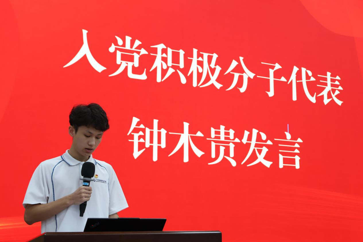 随后,由2024级入党积极分子代表钟木贵上台发言,他表示,通过深入学习和领会党的路线政策方针,对中国共产党有了更深刻的认识,更加坚定了他入党的决心,同时作为一名学生干部,肩负起多个岗位的责任与担当,在实践中日益丰富着自己的履历。他激励在座同学们要积极向党组织靠拢,认真学习理论知识,在实践中勇于尝试与挑战。