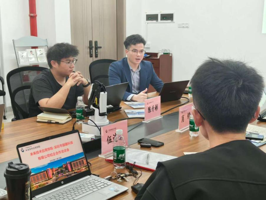 2025年11月18日下午,深圳市越疆科技有限公司朱海杰经理、陈升彬经理一行来访太阳成tyc234cc,就机器人实训建设、课程资源对接及外聘教师合作等事宜开展座谈交流。此次会议由学院科研副院长肖铮、人工智能教研室副主任李哲宏及智能机器人专业专任教师孙洪伟、谢胜灵共同参与。