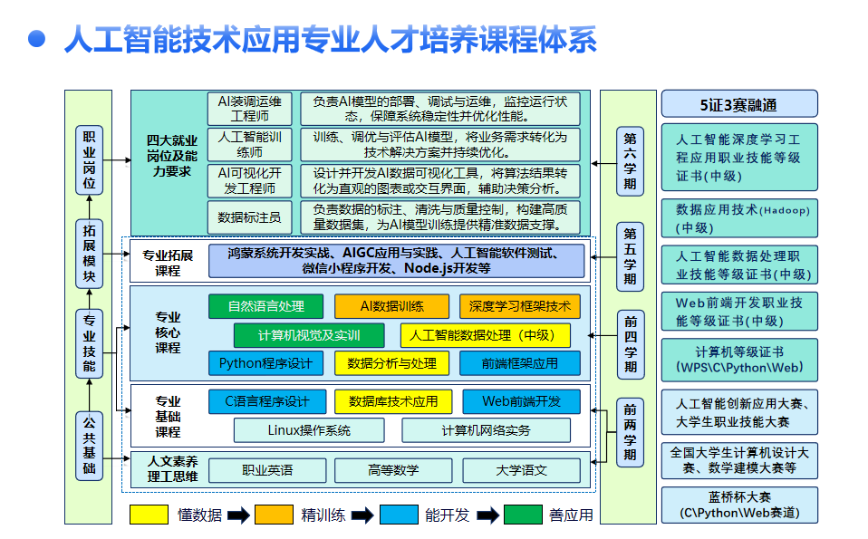 (3)职业定位明确,就业前景广阔。专业旨在培养能够在人工智能相关的应用开发、系统集成与运维、产品销售与咨询等领域工作的高素质技术技能人才,随着人工智能技术的广泛应用,相关领域的就业需求不断增长,就业前景广阔。
