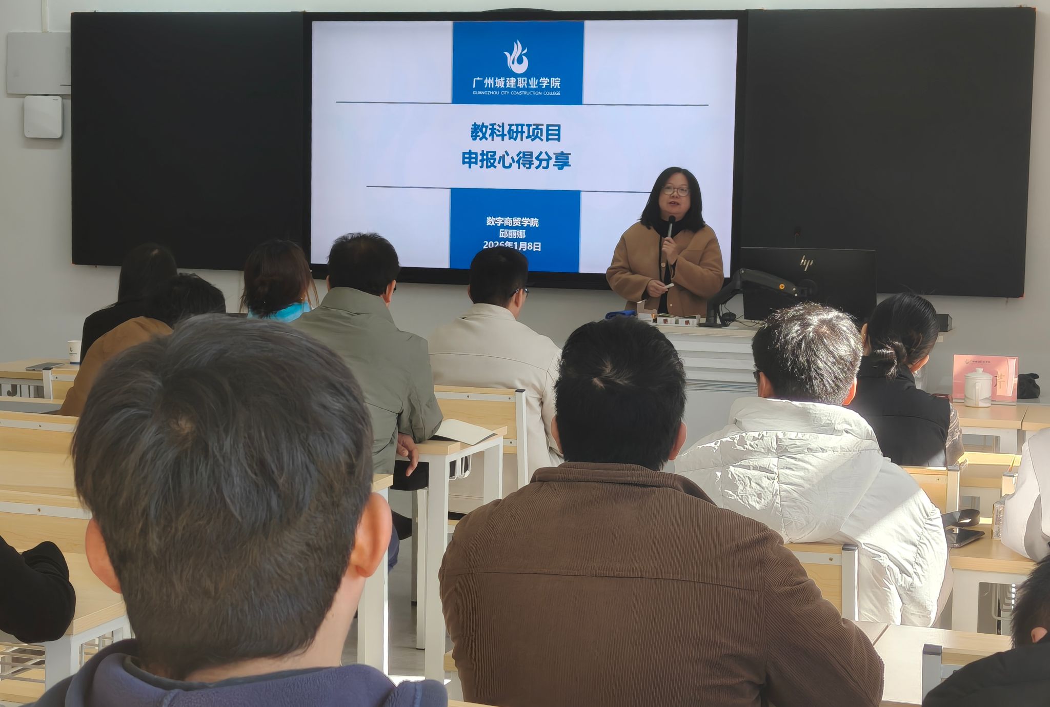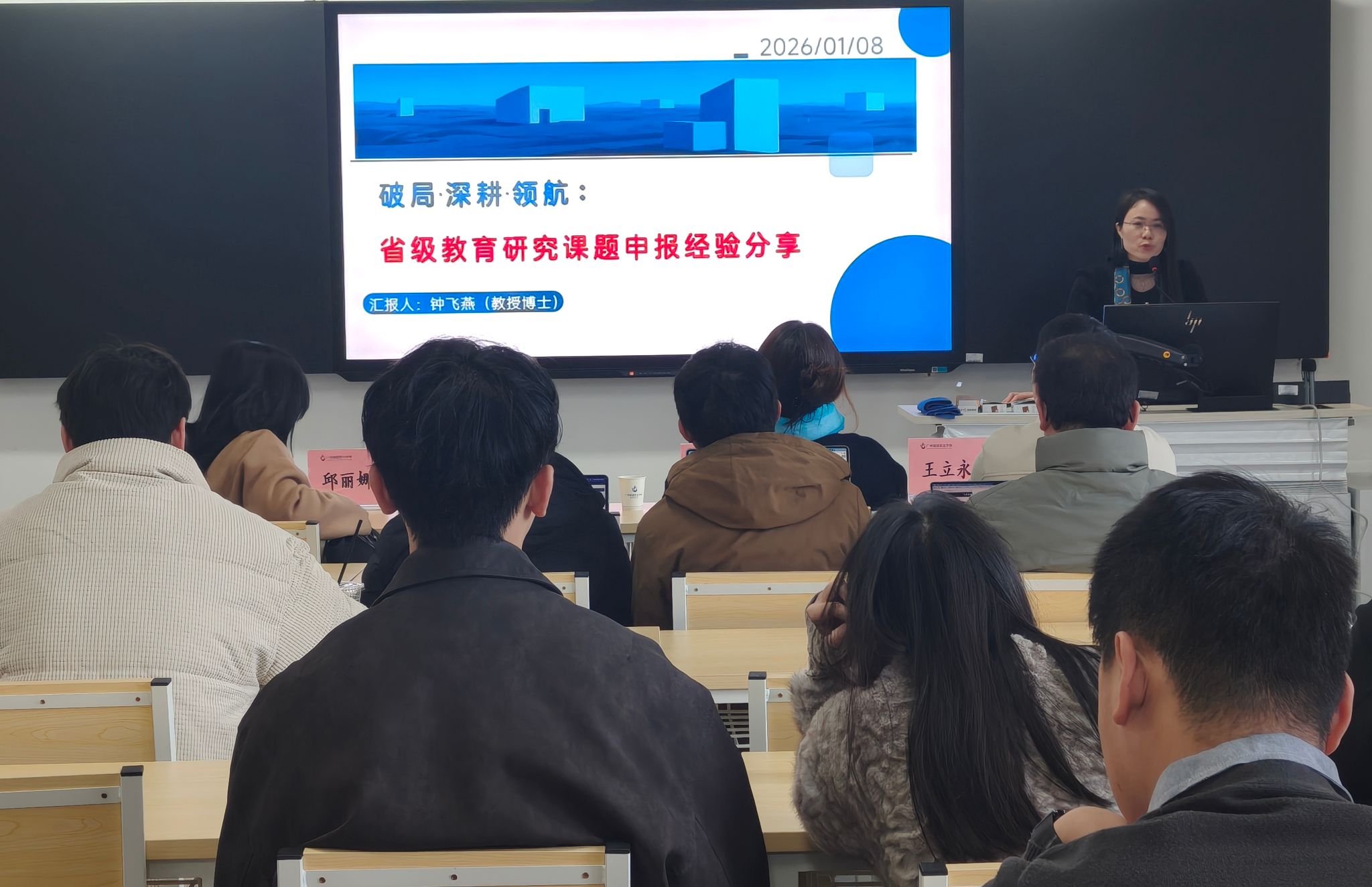 2026年1月9日上午,太阳成tyc234cc在F3-203教室举办“教科研项目申报与研究”专题培训会。学院特邀钟飞燕教授和邱丽娜副教授作专题分享,学院院长潘丹、副院长郑永芹、王立永及全体教师出席本次活动,会议由教学副院长郑永芹主持。