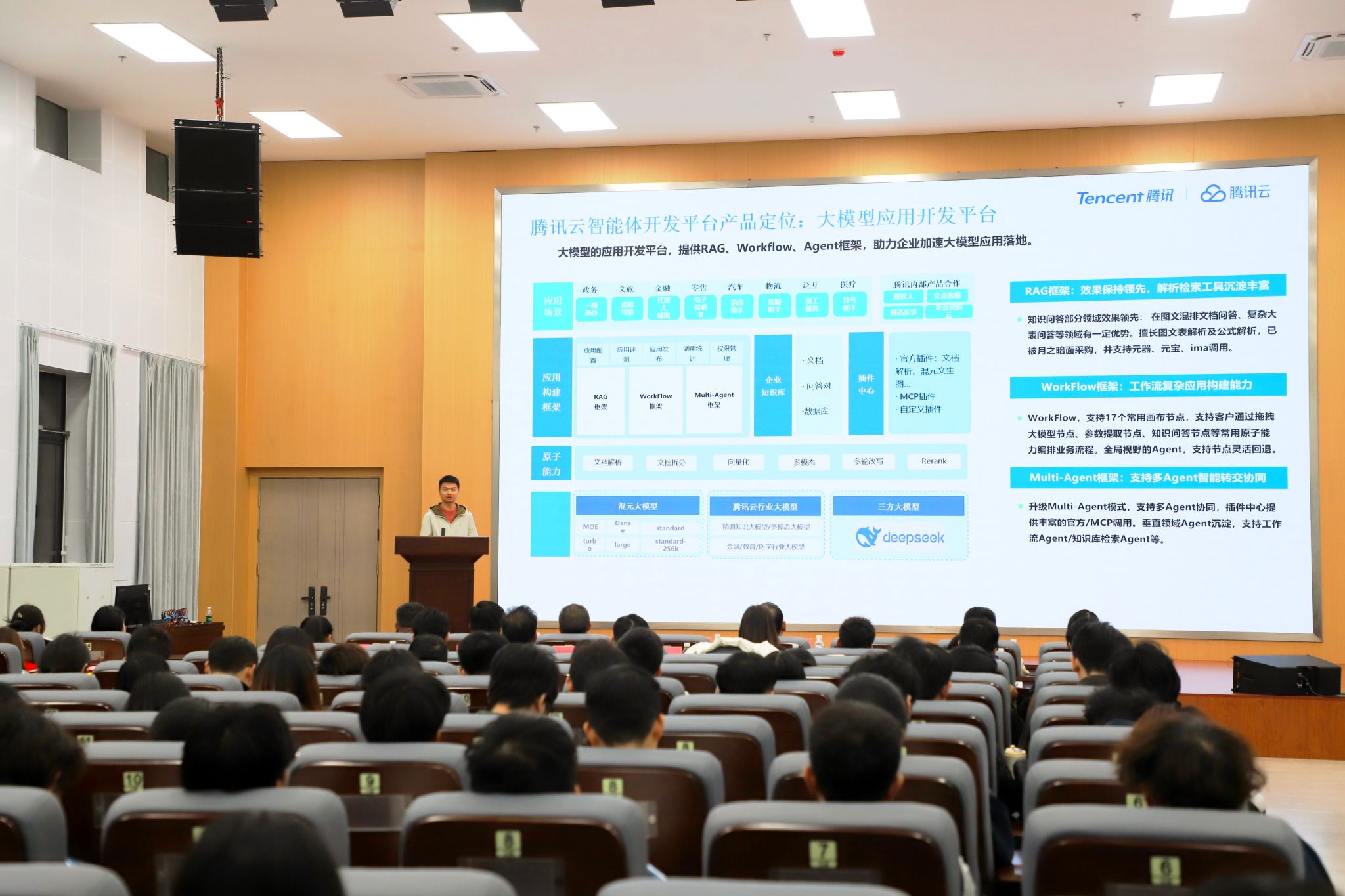 会上,各合作企业代表分别结合自身产业领域,分享了与产业学院共建订单班的规划与路径。腾讯云代表谌龙系统介绍了校企协同数字化人才培养体系,并对接人工智能技术应用重点推出“腾讯人工智能创新班”。该班将依托腾讯云职业认证体系与实践平台,构建“岗位能力模型—课程体系—实训平台—职业认证—竞赛实践—实习就业”全链条培养机制,实现课程共建、能力共评、就业共促,为人工智能领域输送高素质技术技能人才。